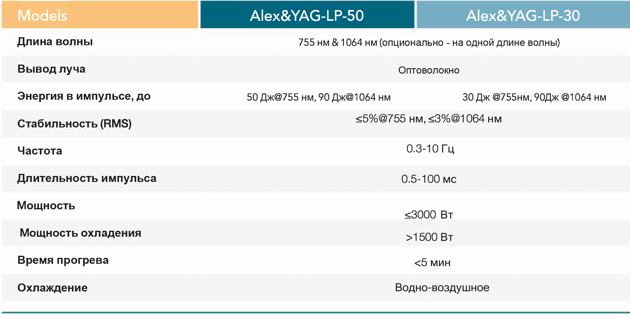 оптимальными длинами волн для удаления волос и пигментации на коже любого типа (I-VI). высокая энергия в импульсе (50 Дж на 755 нм и 90 Дж на 1064 нм) и частота до 10 Гц позволяют лазеру эффективно работать в том числе и на больших площадях. В дополнение, для ускорения процесса интеграции в систему, Alex&YAGLP может быть оснащен манипулой (диаметром от 2 до 24 мм) и другими компонентами, такими как блок питания, волоконный вывод луча и система охлаждения