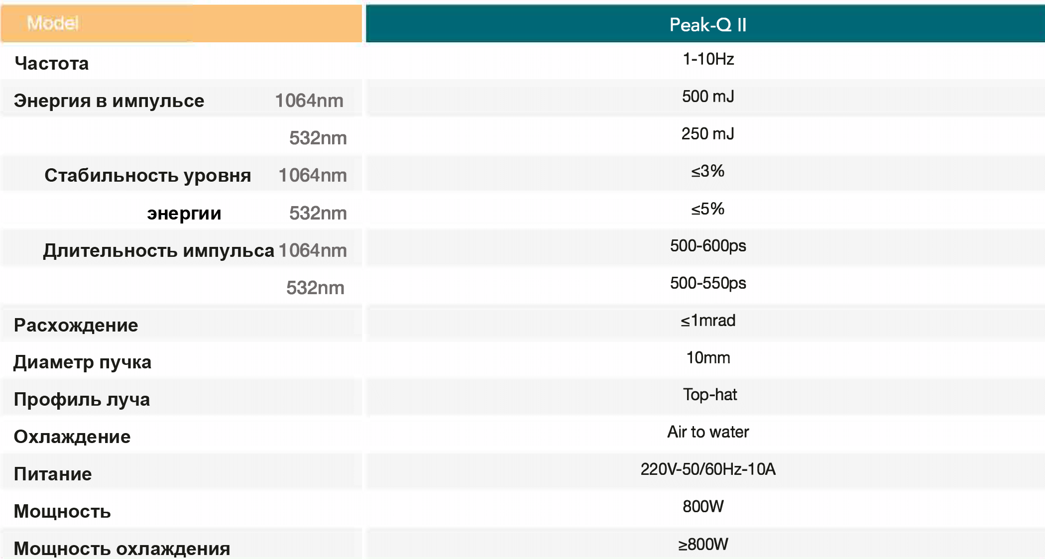 В лазере Peak-Q II, компания Beamtech Optronics реализовала запатентованную продвинутую технологию лазерной инжекции с целью предоставить потребителям качественный и недорогой продукт. Сочетание 500 пс импульса с энергией 500 мДж, идеального распределения энергии в одном устройстве, новым поколением для удаления пигментных пятен и татуировок. Энергопотребление лазера составляет всего 800 Вт, что