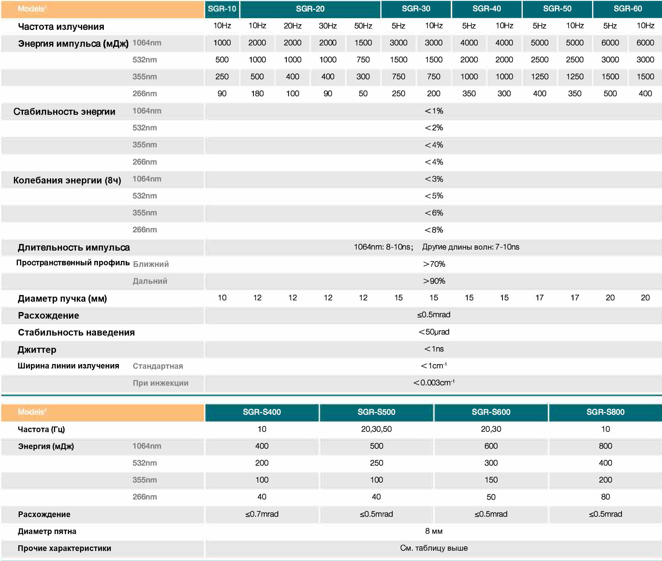 Серия SGR - мощные импульсные наносекундные лазеры. Энергия импульса на базовой длине волны составляет от 400 мДж до 6 Дж SGR, другие гармоники доступны как опция. Особенностями серии являются высокие уровни энергии импульса и энергетической стабильности, поэтому лазеры этой серии превосходно подходят для лазерного упрочнения, LIDAR, генерации плазмы, накачки Ti:Sa лазеров и ОПГ. Резонатор собственной разработки позволяет равномерную накачку рабочего кристалла, что гарантирует эффективность работы и более высокие уровни накапливаемой энергии за счет отсутствия лишних колебаний в резонаторе. Резонатор сконструирован из химически инертных материалов, выдерживающих высокие уровни энергии и поглощающих нежелательное ИК и УФ излучение от ламп накачки. Из-за высоких параметров мощности, особый упор сделан на